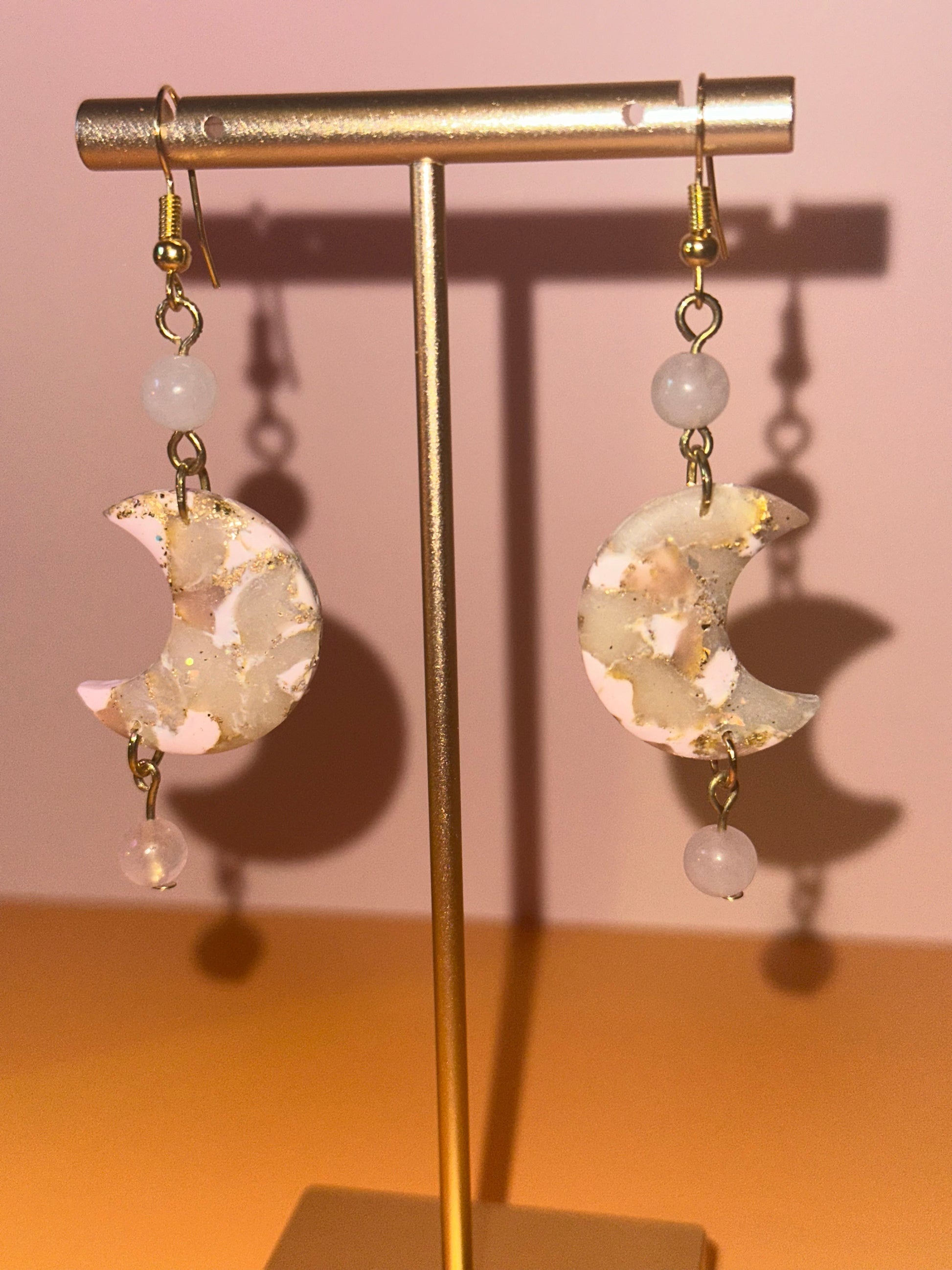 These clay earrings feature a natural stone design with rose quartz beads and gold inlays. The unique design adds a touch of elegance and sophistication to any outfit. Handcrafted with love, these earrings are a perfect addition to your jewelry collection.